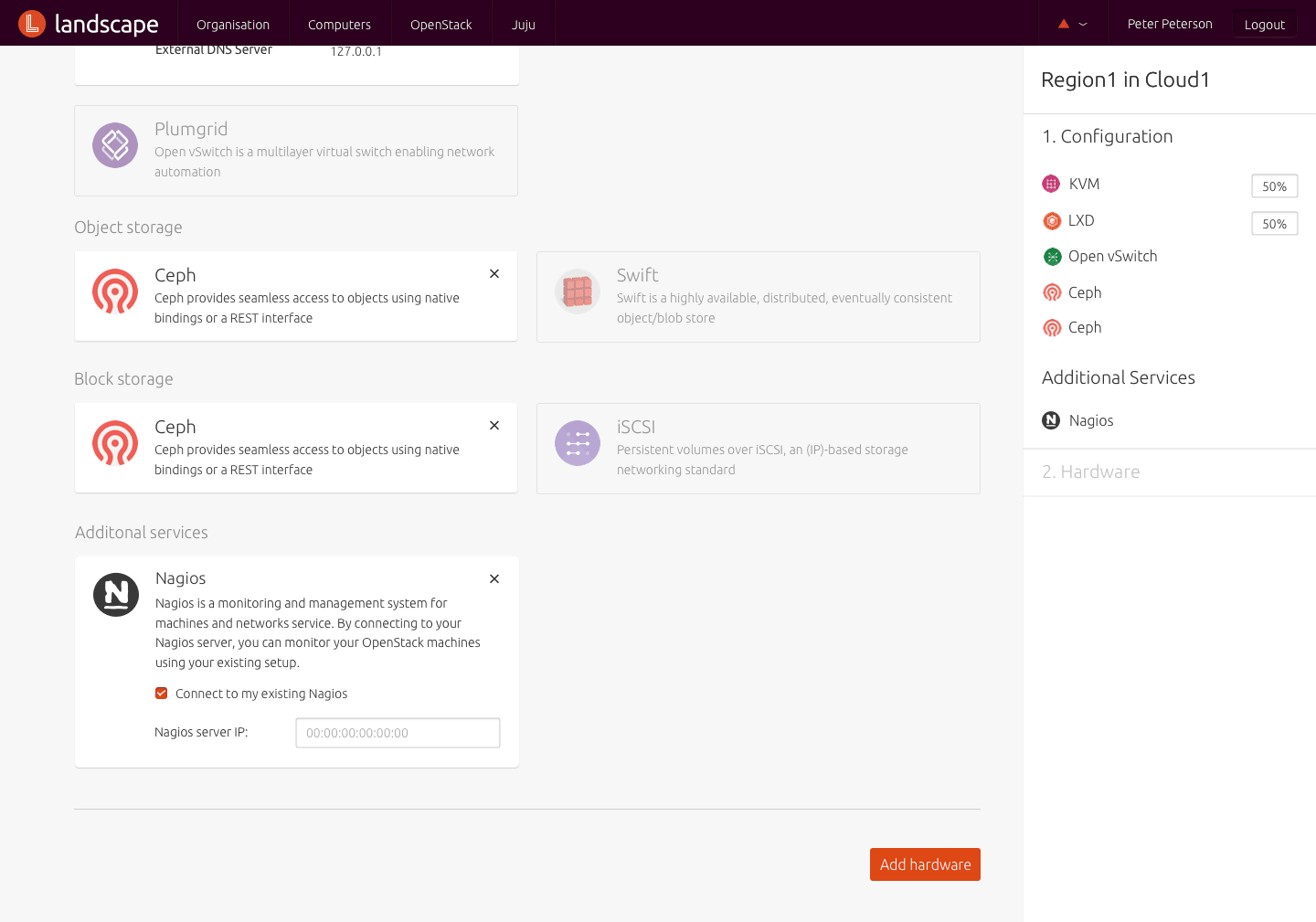 The first feature we added was the ability to add hardware to the cloud. This makes it possible to grow a small test cloud into a production sized solution. We also added the ability to integrate the cloud with Nagios, a common monitoring tool. This means if something happens on any of the cloud hardware, users would receive a notification through their existing monitoring system.