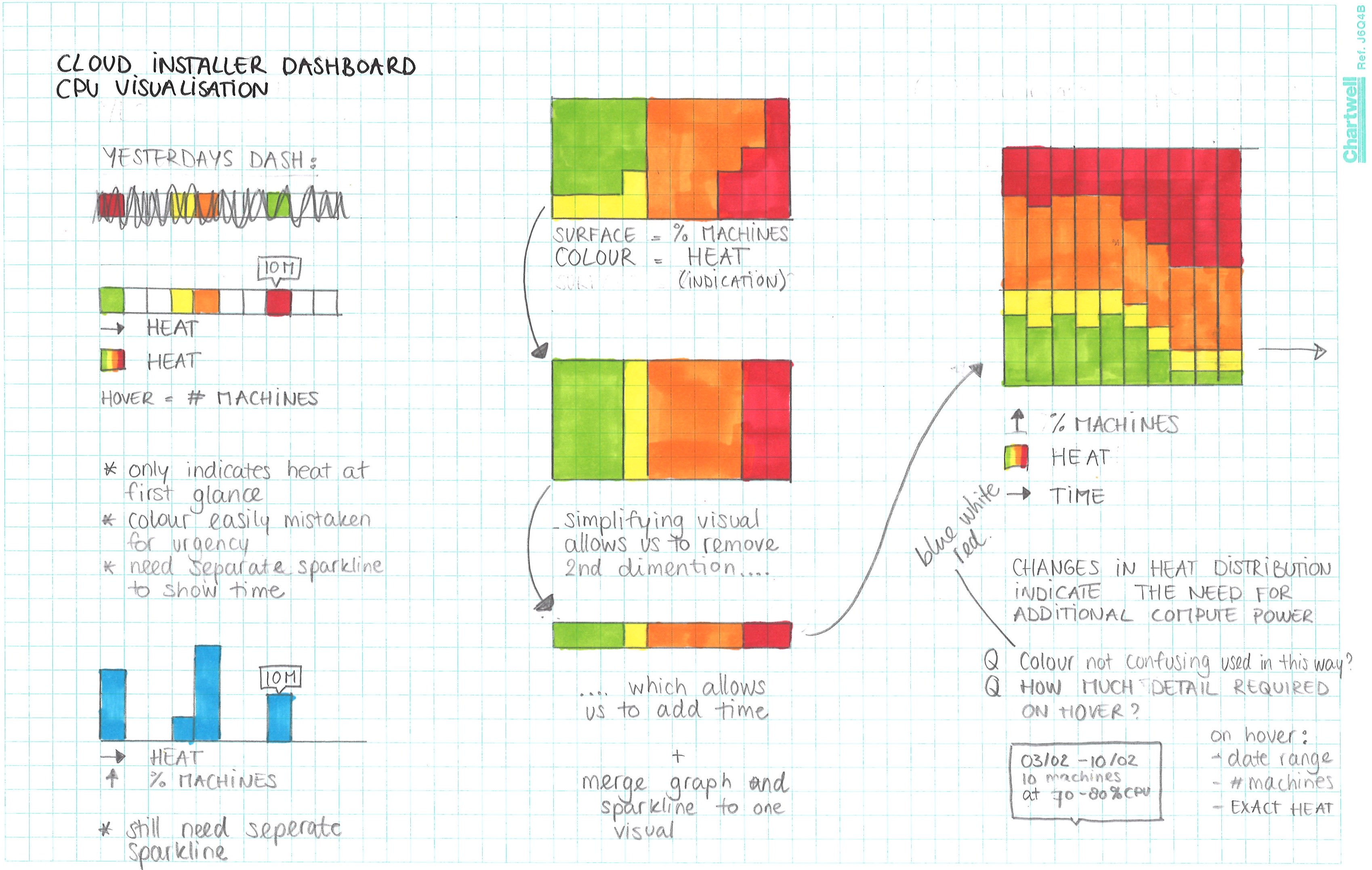 After some more competitive research and exploratory sketching, we decided to merge the graphs for each section by putting the utilisation on a vertical axis and the time on the horizontal axis. This seemed to improve the experience for our engineers, but we also wanted to validate with users in usability testing, so we tested the designs with eight participants that were potential Autopilot users. From this testing we learned to include more information on the axes and to include detailed information on hover.