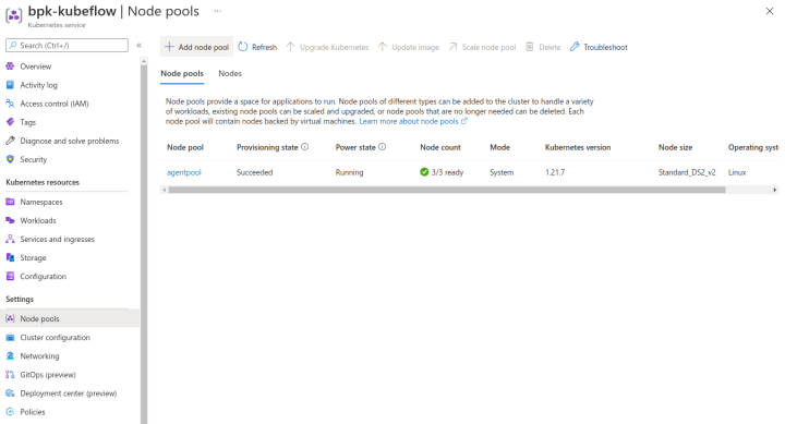 In the cluster, details screen go to Settings -> Node pools. We have only a single agentpool that hosts Juju and the Charmed Kubeflow pods. We want to add an additional node pool that will contain the spot instances. The spot instances will then be configured so that no applications can be accidentally placed there.