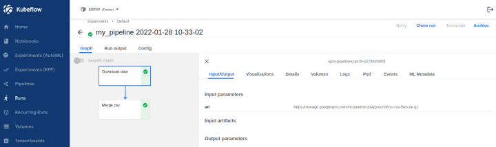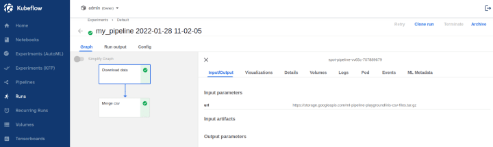 For the first run don’t change anything, open and run the 01-base-workload notebook. Let’s see default Kubeflow Pipelines behaviour. To see the Workflow Run details click on the “Run details” link in the Kubeflow Dashboard and the Kubeflow Pipelines UI will be shown.
