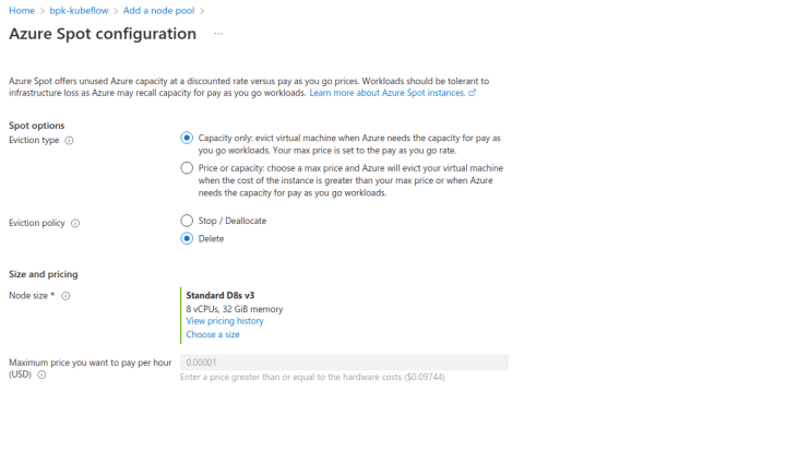 Azure Spot configuration is important. You specify there when your nodes can be evicted and how (“Eviction type” and “Eviction policy” respectively). If your workload has a maximum price over which it is not worth running it – you can put it here.
