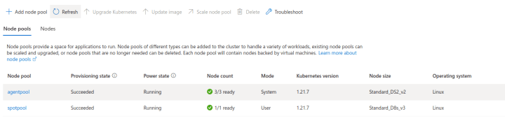 After completing all required fields, go ahead and create the pool. It will take some time for VMs to start up. You can check if all the nodes are available in the Azure portal’s “Node pools” tab or using kubectl