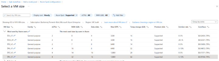 Now it’s time to select the node VM size. The Azure portal shows the current cost per hour with the spot instance discount included. You need to be aware that the prices change dynamically. Additionally, the Eviction rate presented there is not a guaranteed value. All these parameters are important when selecting the VM size and calculating the TCO of using spot instances.