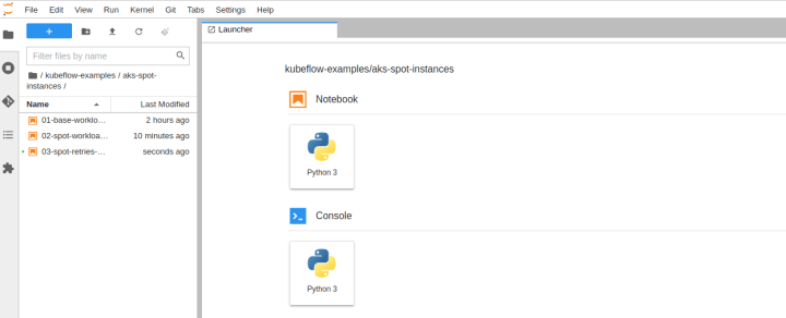 Create a new notebook in the Kubeflow notebooks and clone the repository from: https://github.com/Barteus/kubeflow-examples. Notebooks for this blog post are in the aks-spot-instance folder. You can follow along or run the notebooks from the folder. We have numbered them for easier following.