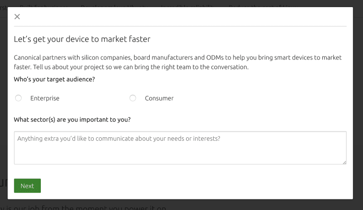 We completed the roll out of the section specific interactive contact us forms throughout https://www.ubuntu.com. If you add `#get-in-touch` to any URL on the website it will open an interactive contact us form. The new form you to provide more information about your request without leaving the page you are viewing.
