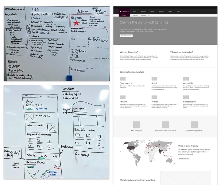 Careers section is starting to become outdated and could do with some more content that conveys Canonical’s culture and our office environment. We started with brainstorming and ideation sessions identifying problems, looking for solutions, gathering our ideas and looking at what we think are good examples/practices. After these sessions, we started producing wireframes and sharing them with stakeholders and peers to get their feedback. This is an iterative project that will continue for some more time.