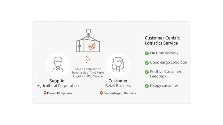 Being customer-centric means having customers at the centre of organisational decision making and focusing on creating ways to deliver a positive customer experience. It also entails having a customer-first culture by prioritising understanding of the customer’s goals. Further, it means being able to understand the economics of customers and understand the costs and benefits of delivering the best customer experience. Lastly, being able to focus on high-quality execution, with a high level of trust and engagement with customers. Figure 1 below shows some factors that make customers happy, which are also considered as success factors of logistics services. The image also describes a scenario where a supplier has hired a logistics company to manage the logistics of a product shipment to a customer’s retail business based in Europe.
