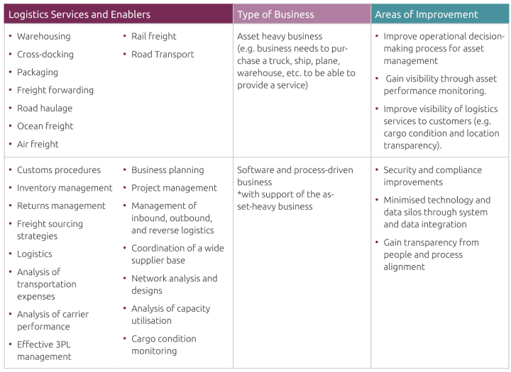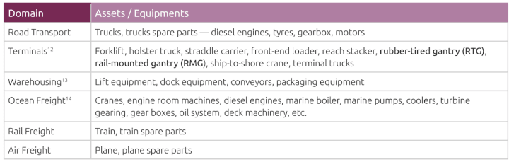 There are multiple assets used to run the operations in the logistics sector, such as warehouse equipment, road transport trucks, and spare parts. However, poor operational decisions on maintenance and repair can lead to this equipment not being fully utilised. The table below gives some examples of these assets and equipment.