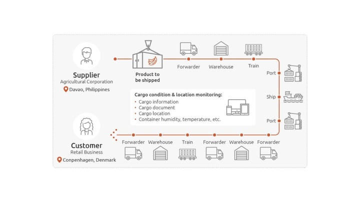 The real-time cargo visibility assistant is an end-to-end system that tracks and monitors the cargo journey, including cargo information, condition, and location. The service includes sharing data with the customers in real-time. For example, Figure 1 below describes a supplier based in the Philippines who would like to export bananas to a retailer based in Copenhagen, Denmark. The cargo handling of bananas needs appropriate care in the whole transport and logistics leg. In addition, this cargo requires specific refrigeration temperature, moisture, and ventilation conditions. Otherwise, it will have a risk of premature spoilage. Therefore, the supplier can access a cargo visibility app. The app provides cargo information, location, and conditions, such as humidity and temperature.