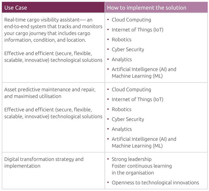 Implementing the use cases described in the previous section requires multiple technological innovations. The table below illustrates the technologies that can help build the use cases. For example, the real-time cargo visibility assistant product will require various technical set-ups, well-working cloud computing technologies, high-level implementation of IoT, robotics, cyber security, and data-related solutions.