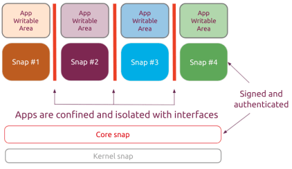 The OS is fully built from snaps, containerised software packages with strict fine-grained control over permissions and interfaces: snaps give users the kind of control that other packaging systems don’t, and Ubuntu Core only runs strictly confined snaps.