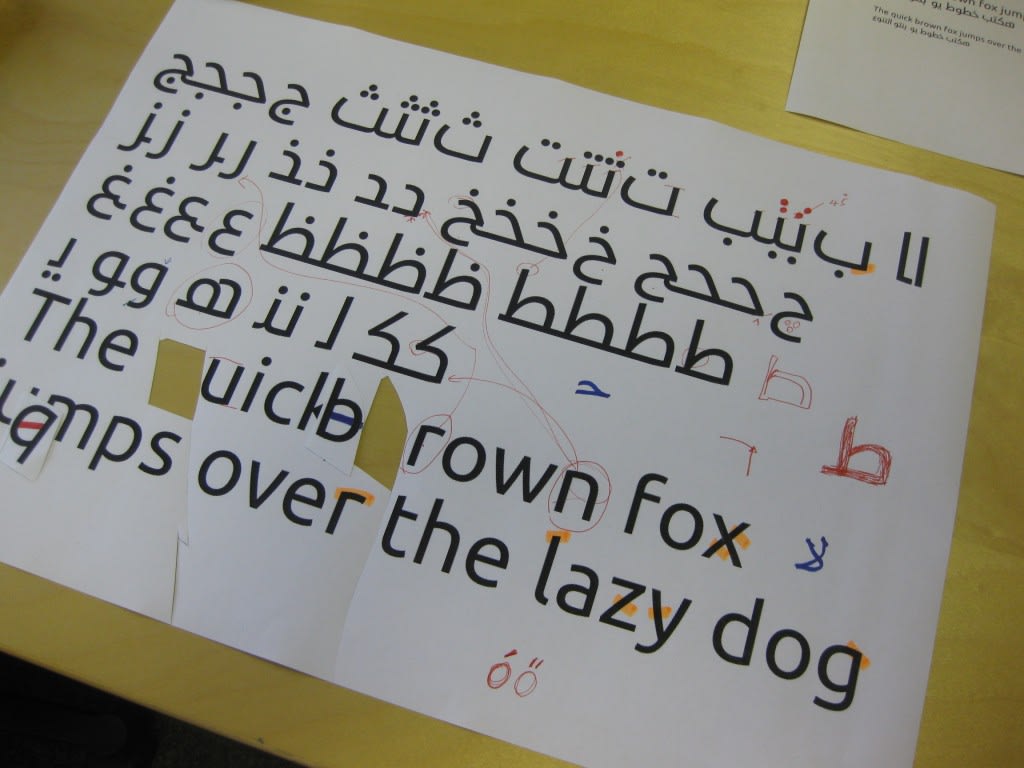 The last two months we have also worked on the Arabic design. As with many complex and exotic scripts the challenge is to translate the look and feel of the Latin to the non-Latin script. Our design team, lead by Ron Carpenter, developed a wide range of initial concept trials to define the design features and texture of the Arabic and presented these to our consultant Prof Rayan Abdullah. Together we discussed and refined the trials until we arrived at the design that we are now all happy with: a primarily Kufic design that is tempered with some Naskh elements to make it suitable for text size reading. The strong Kufic influence makes this font particularly suitable for short entries in UI design for future Ubuntu Arabic localisations.