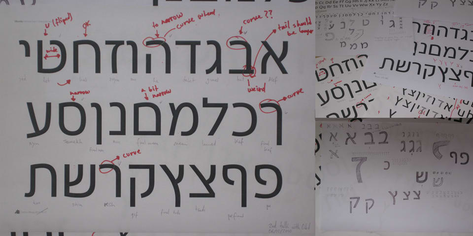 The Hebrew Regular is now completed and Pilar is proceeding with designing the Italic style. Some studies suggest that if the Italic is leaning in the same direction as the Latin it should be a simple slanted. We will, however, inject some cursive elements into the Italic to maintain stylistic coherence with the Latin.