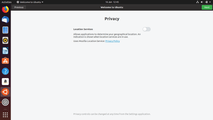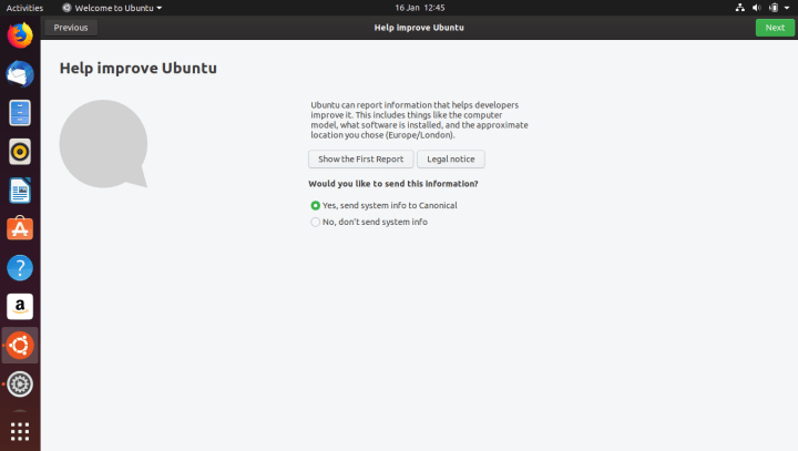 Once Ubuntu starts for the first time, it will ask you to configure a few things. You have the option to configure your online accounts – this is somewhat similar to how you’d do this on a smartphone. This will make the configured accounts available to applications that support this functionality. For example, you can integrate Google Docs and Google Calendar into your Ubuntu desktop using Online Accounts. You can also send a system information report to Canonical, and enable location services, which may be used by applications that require it.