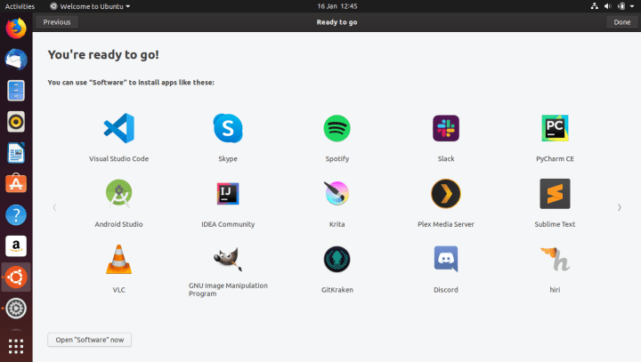 The last step in the first-login wizard will show you a grid of popular applications available in Ubuntu Software – the app store for Linux. At this point, you can install some popular applications you like or need. You can also do this later on, at any time. We will review this functionality shortly.