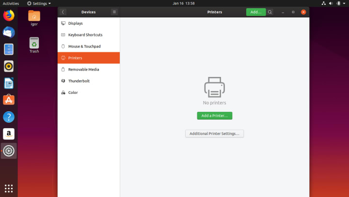 You can manage different hardware components and peripherals attached to your computer using the Settings utility (Activities > Settings). In most cases, you will have a simple guided wizard to help you configure your hardware. Sometimes, it may not be trivial, or Ubuntu may not have the necessary drivers to setup your hardware. This can also happen in Windows, and you may need to download drivers yourself.