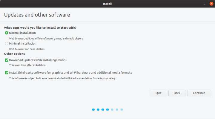 The fourth step is to decide what setup you like. Most people want the normal installation, which comes with a complete desktop and a set of productivity applications. You can also choose to install third-party software, graphics drivers and media codecs (last checkbox). This is recommended, as it will give you access to a wider range of applications and use cases.