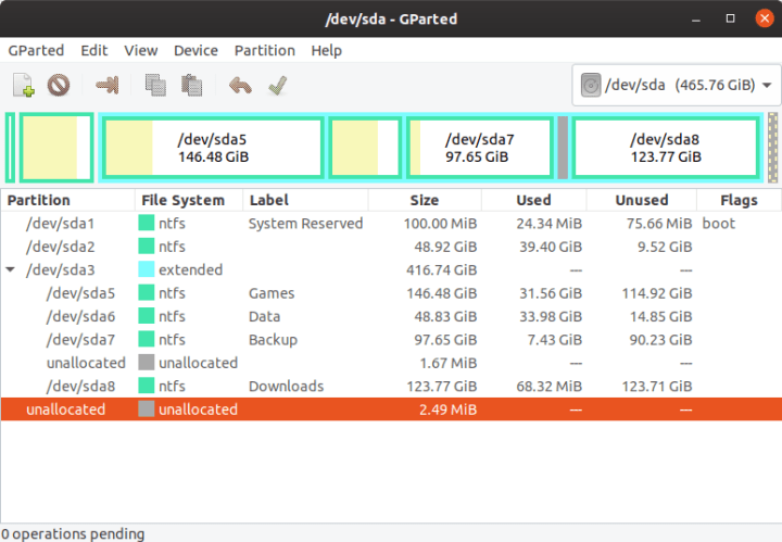 From the data presented by GParted, we do not have sufficient free space, so we will need to change the partition layout. We can either delete one of the non-C:\ partitions, or resize them. The last partition, dev/sds8 (labeled Downloads) looks like a good candidate. It is a large partition, and most likely contains less critical data. Click on a partition and select Resize from the menu. Gparted will attempt to run this operating, and if successful, you will have free space available to set up Ubuntu.
