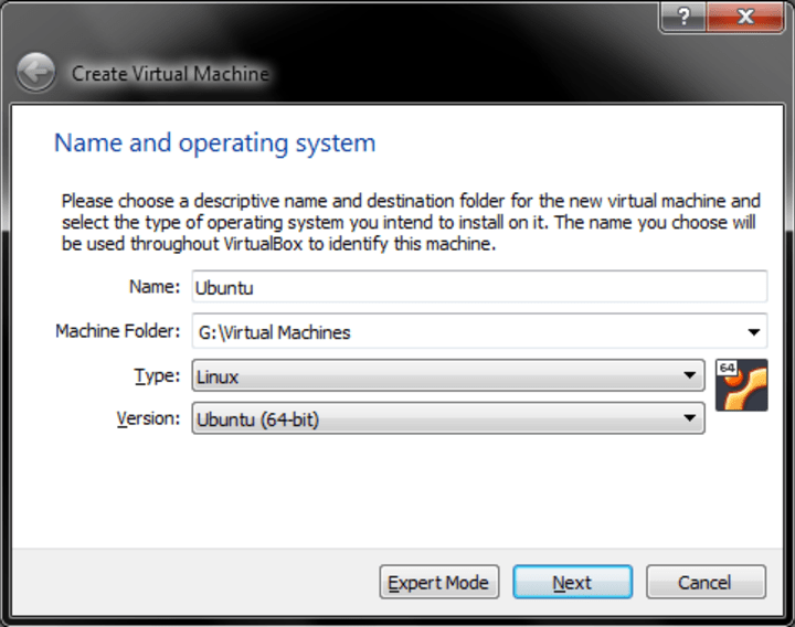Once VirtualBox is installed and configured, start the application. Click on the New button. You will now be asked several questions. You will need to provide the name for your virtual machine (VM). You can use anything, like John or Jane, but it is best to use the exact operating system version. If you type in Ubuntu, VirtualBox will automatically detect what you’re trying to do.