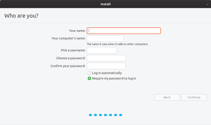 The optional third step is network. If you’re using a desktop and have a wired connection, you probably won’t see this step in the installer. If you’re on a laptop with a wireless connection, the installer will ask you if you want to connect to an access point. This is not mandatory, but it does allow you to install updates before you get to the desktop. Alternatively, you can connect to the network from the top taskbar (panel), via a drop-down menu in the right corner.