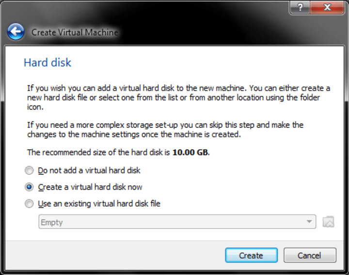 The next step is decide how much RAM you want to give your VM. Then, you need to configure a virtual hard disk. Once these steps are complete, the VM is ready to start. However, we also need to attach the Ubuntu ISO to it.