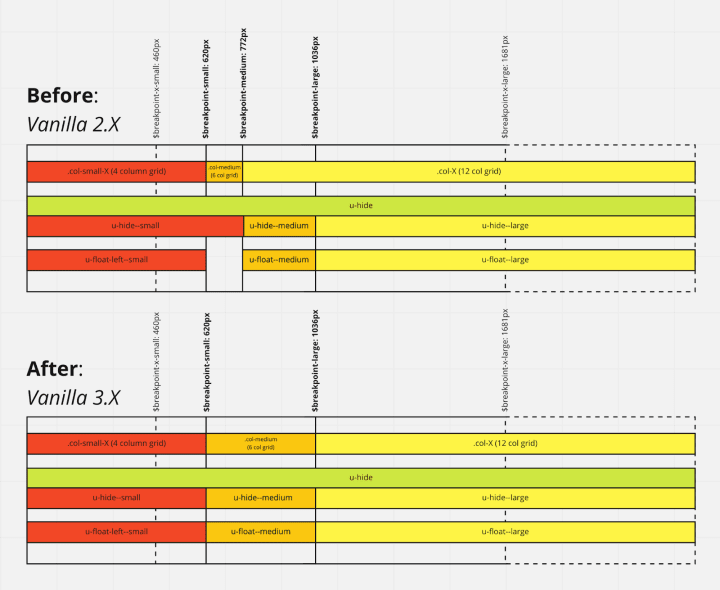 While working on updates for Vanilla v3.0, we noticed some inconsistencies in the way different parts of the framework were using media query breakpoints. It seemed that different components and utilities changed their responsive behaviour or style at different breakpoints, making it harder to understand how screen size affects the style or layout.