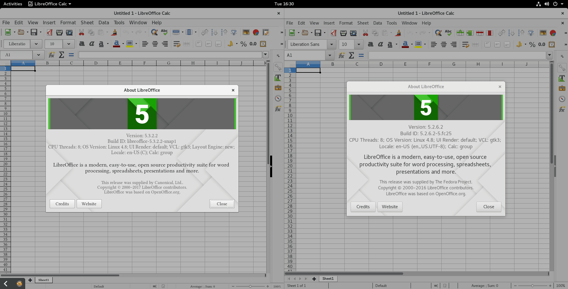 As an example, here is LibreOffice running from the snap (5.3.2.2), next to the one available in a fully upgraded Fedora 25 (5.2.6.2).