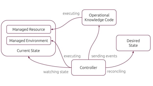 All three roles are connected. The controller maintains a state of the managed resource (“watching”). Depending on the required operation, the controller triggers an operational task implemented by the operational knowledge code. The implementation of the task is specific to the managed resource. The Operational Knowledge Code hides the implementation details from the controller.