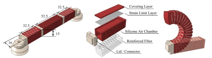 The robot has three fibre-reinforced pneumatic actuators to control the tail, head, and body of the robot. A control system monitors the positioning of these actuators and provides a coordinated movement. This is how the robot achieves the inverted U shape seen in the picture.