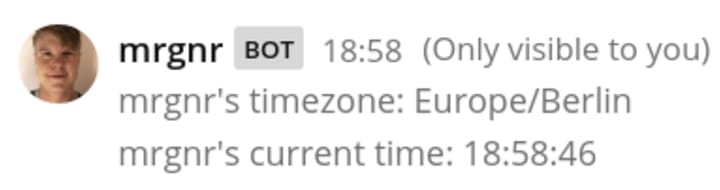 To directly show a colleague’s timezone and local time, we also wrote a /tz command. Running /tz mrgnr