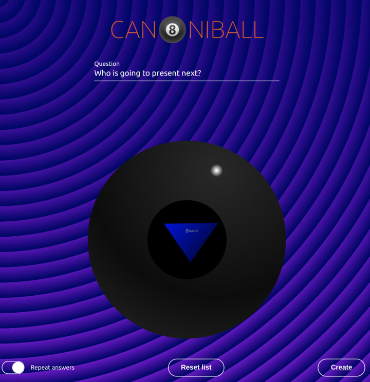 The created balls can be easily shared and bookmarked for future use. We also added an option for non-repeating answers so a squad doesn’t find itself stuck in an infinite loop of presentations.