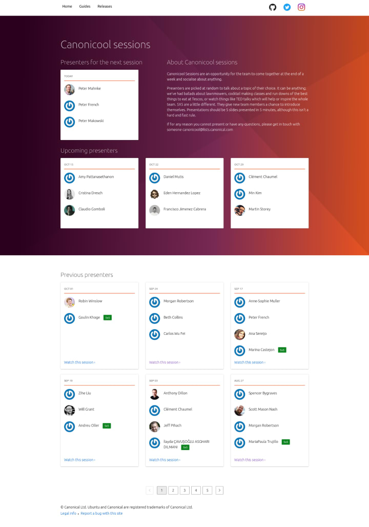 Once we had the formula for selecting presenters, we wanted to present the information in a nicer way than as just another row in a spreadsheet – so we created an API to expose the data, and built a lovely looking page featuring information on the current week’s Canonicool session, the sessions for the next three weeks, and a paginated list of previous sessions. Et voilà!
