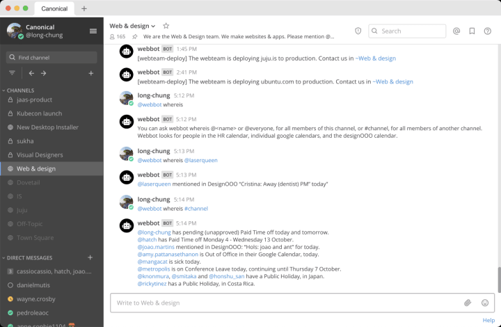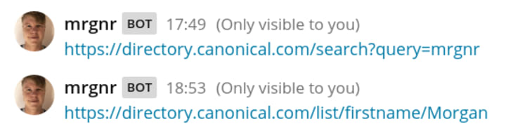 Many of us use Canonical’s internal directory to quickly find contact and timezone information for colleagues. Our webbot’s /dir command generates a directory URL based on a name or search query. Running /dir mrgnr