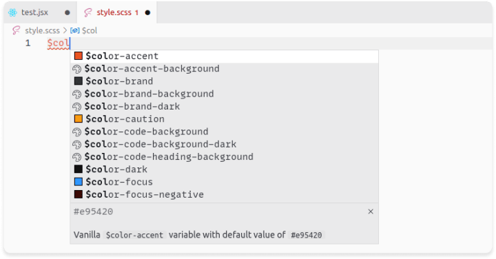 - SCSS variables: Vanilla framework is shipped with customizable SCSS variables that have default values. We added support for variables autocompletion inside a style file (.scss). This allows to be able to easily find the variable that you want to customise as well as seeing a preview of the default value of the variable